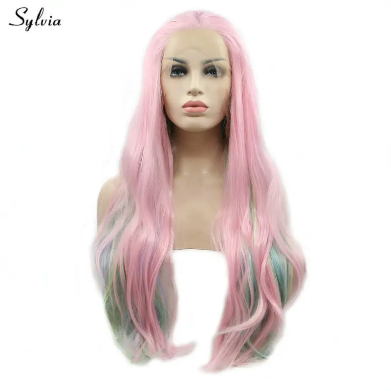 Best Quality Sylvia High Temperature Long Body Wave Hair Pastel Blue Green/Baby Pink Synthetic Lace Front Wigs f